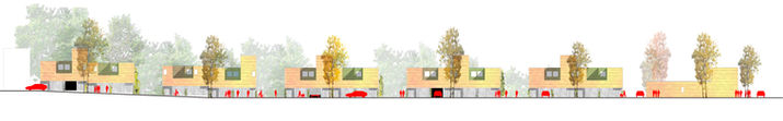La profondeur de l'îlot est donnée à lire depuis les traversées entre les maisons, à l'image de l'ancien faubourg et des maisonnées voisines. les volumes hauts en brique sableuse contrastent visuellement avec les arbres du site.