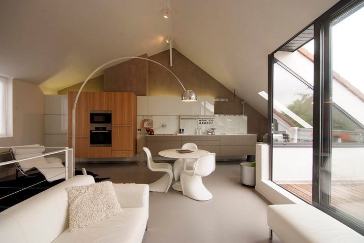 L'aménagement d'anciens greniers situés dans deux maisons de ville a donné naissance à un grand appartement.