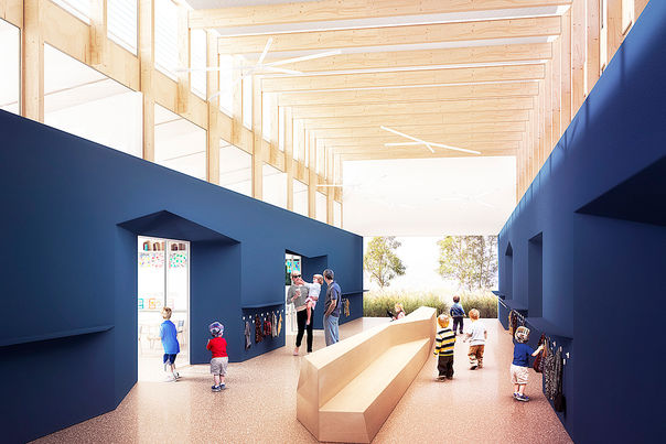 Débords, retraits, préaux mettent en scène un univers piétonnier et paysager à l'échelle de l'enfant.